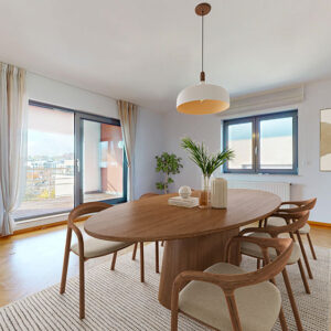 Séjour confortable à double exposition sud-ouest, agrémenté d’une cheminée à feu de bois; accès par baie vitrée à une grande terrasse couverte orientée sud (14,23 m²) équipée d’une pergola bioclimatique à lames orientables;