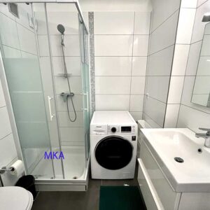 - salle de bains avec douche, vasque et WC et équipée d’un lave-linge/sèche-linge