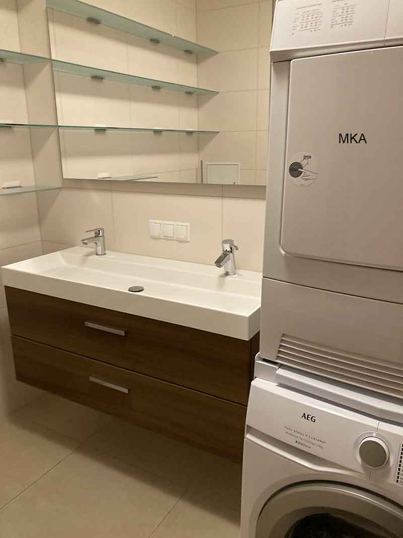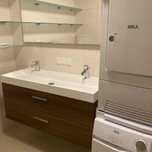 • 1 salle de bains avec WC, baignoire, double lavabo et machine lave-linge et sèche-linge