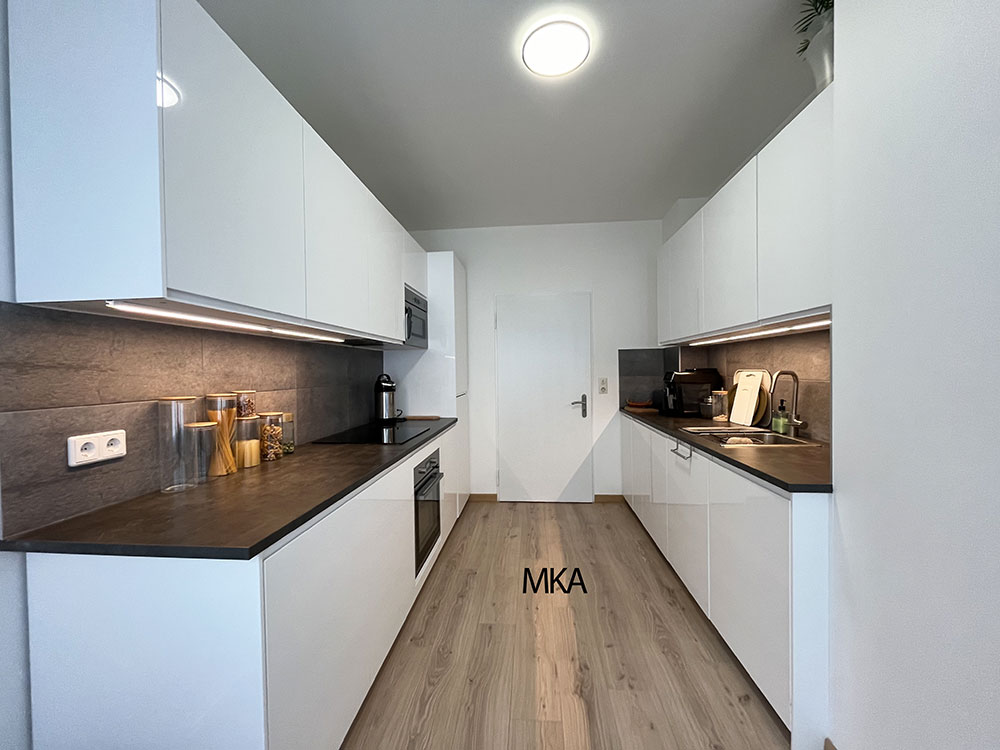 well-equipped, closed kitchen with built-in washing machine/dryer combo