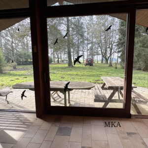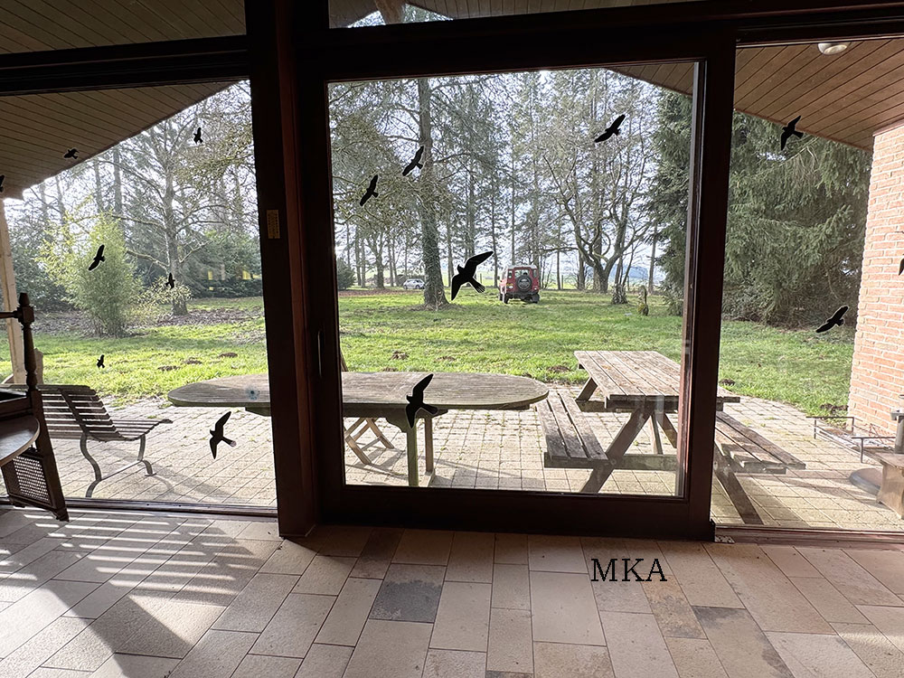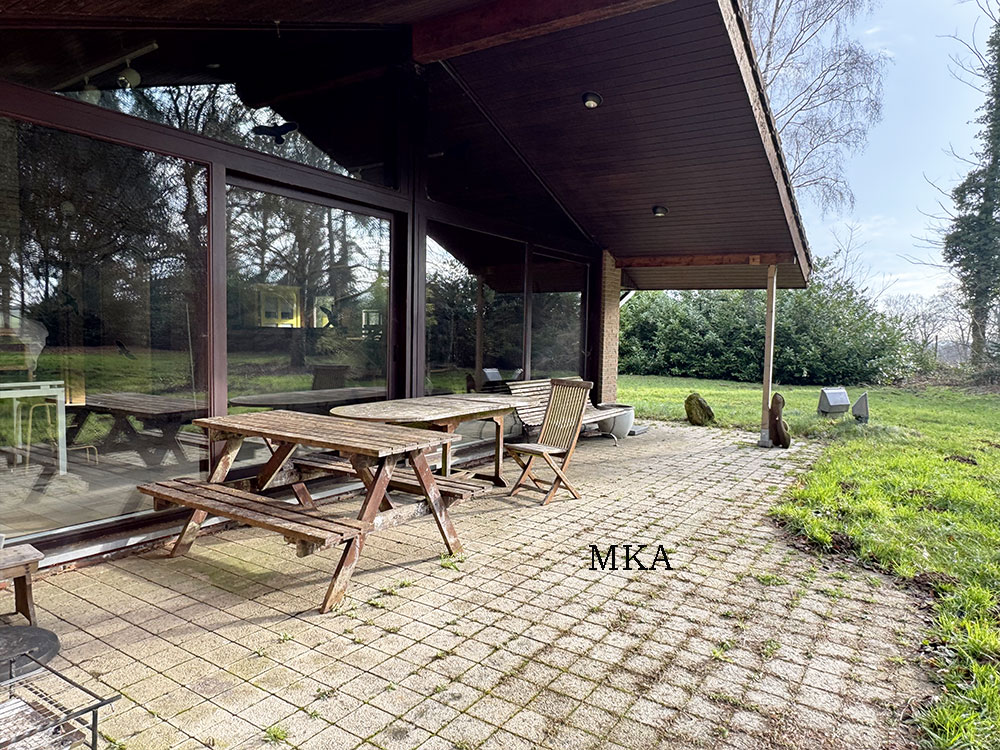 A large picture window opens onto a lovely covered terrace, ideal for relaxing and enjoying the serene green surroundings in all seasons.