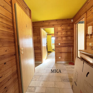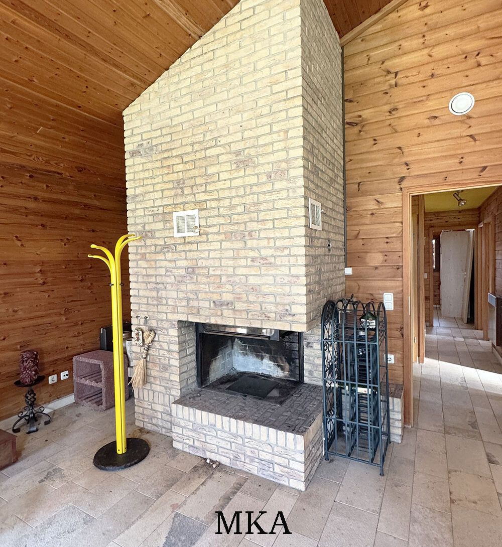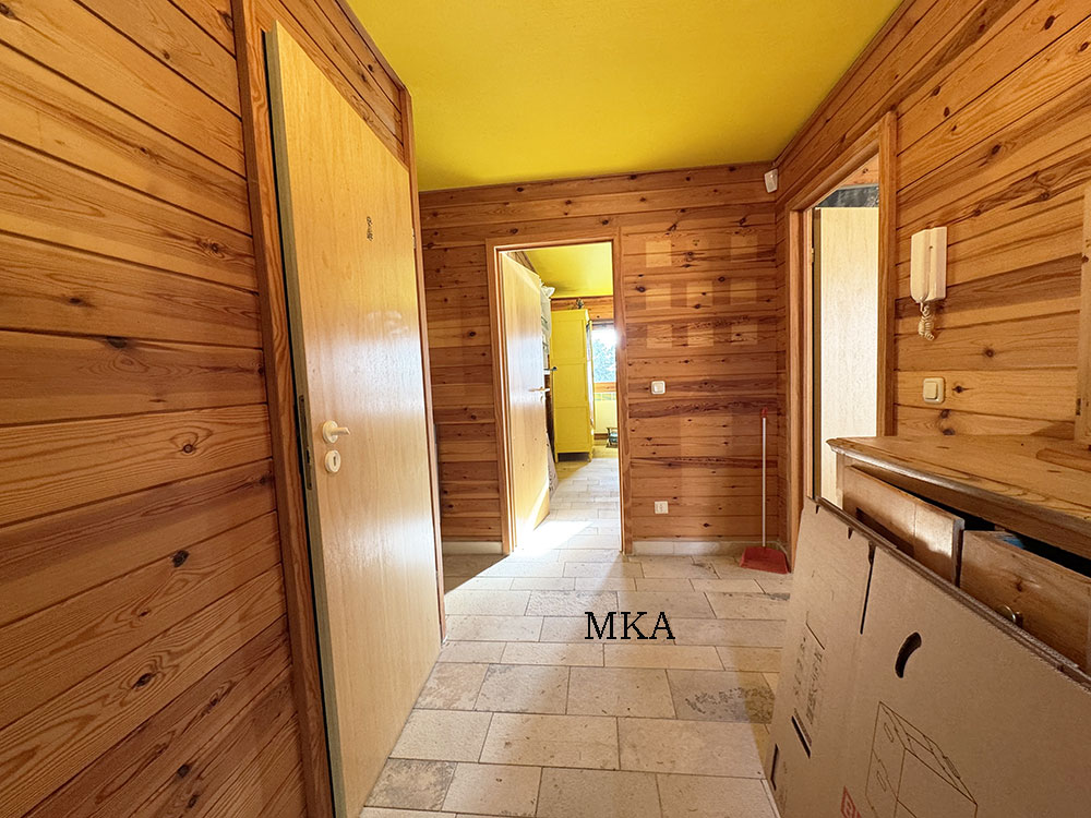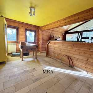 The chalet comprises an entrance hall with guest toilet and hand basin, a separate, partially fitted kitchen connected to the living area by a counter, and a bright and welcoming living room featuring a wood-burning fireplace.