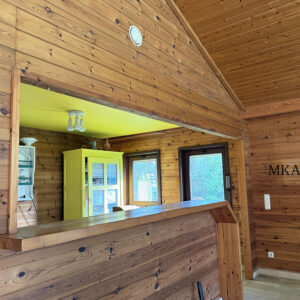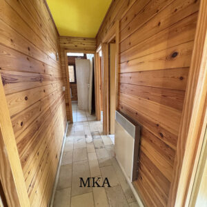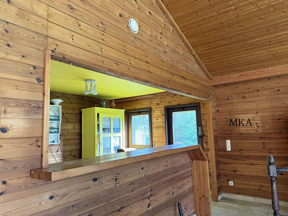 Le chalet s’ouvre sur un hall d’entrée avec toilettes invités et lave-mains, puis se poursuit par une cuisine séparée partiellement équipée, conviviale, ouverte sur le séjour par un comptoir.