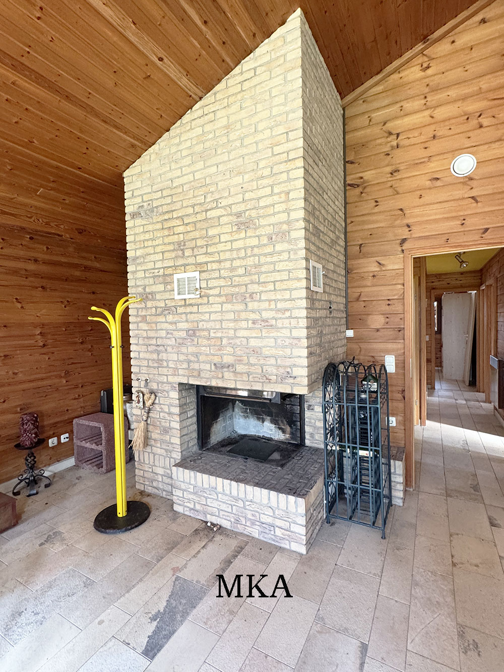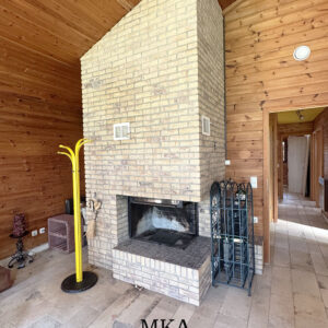 Le séjour baigné de lumière, agrémenté d’une cheminée à feu de bois, invite à la convivialité et à la détente en toute saison. Une large baie vitrée permet un accès direct à une belle terrasse couverte, parfaite pour profiter pleinement du cadre verdoyant.