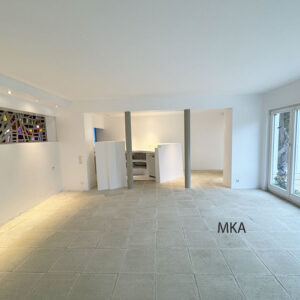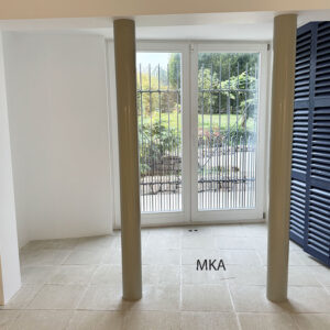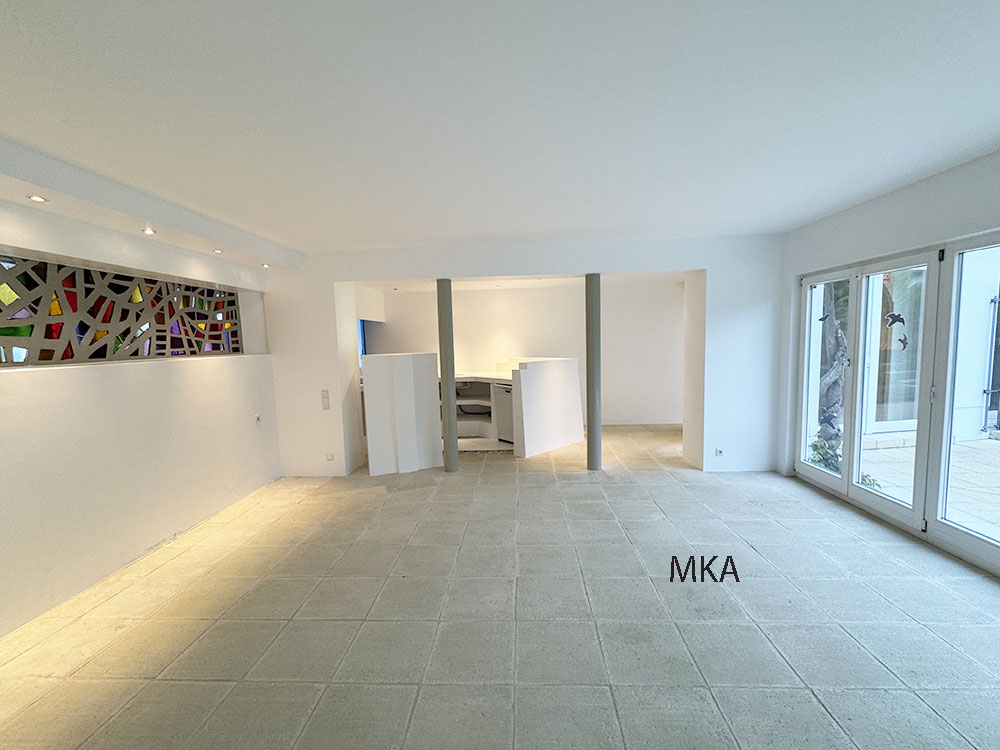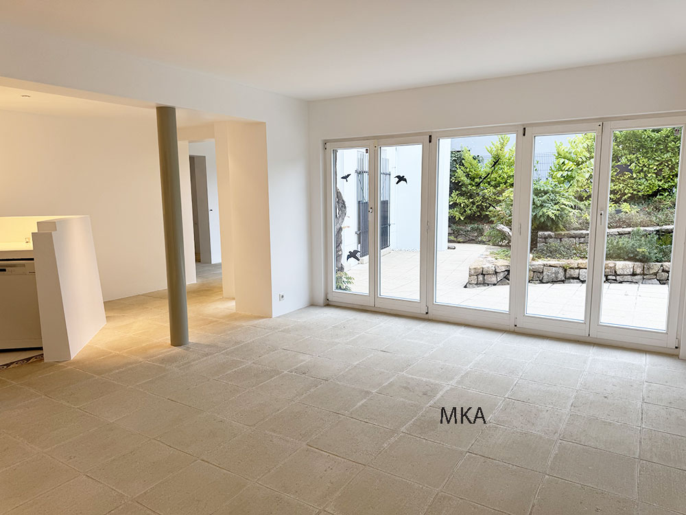 Lumineuse pièce de vie avec grandes baies vitrées ouvrant sur la terrasse et le jardin clos