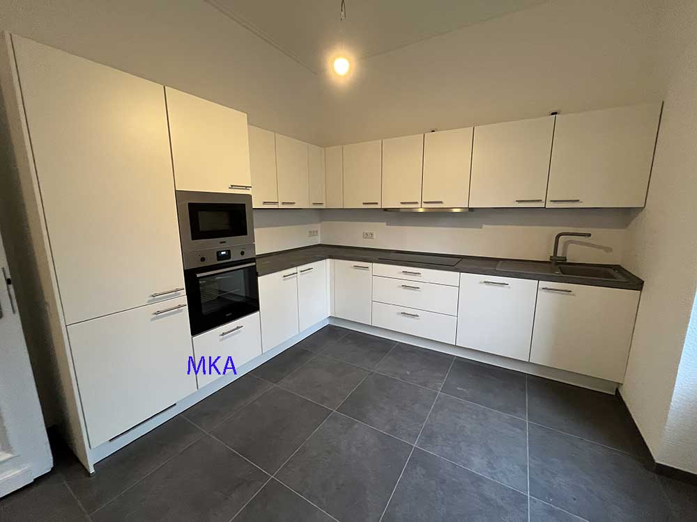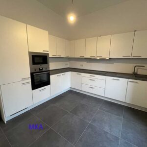 cuisine équipée fermée avec porte fenêtre donnant accès à une terrasse de +/-30m2 orientée nord-ouest et au jardin entièrement clôturé