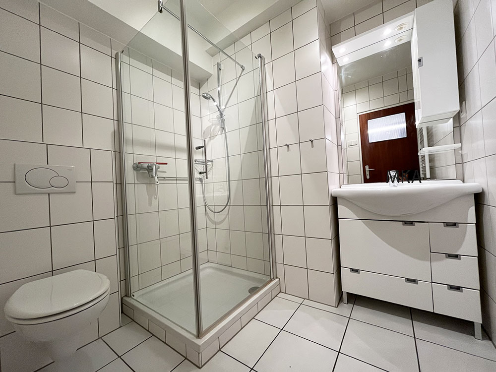 Renovated bathroom with walk-in shower, washbasin and toilet