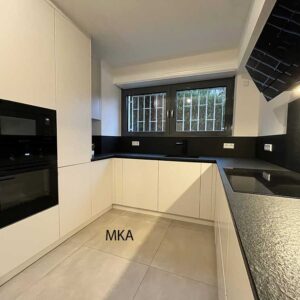 Separate fully equipped kitchen with built-in cupboards, providing access to the garden