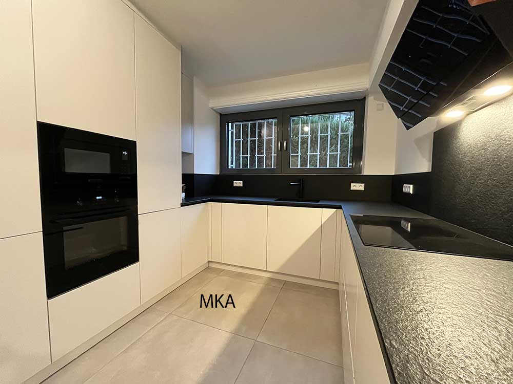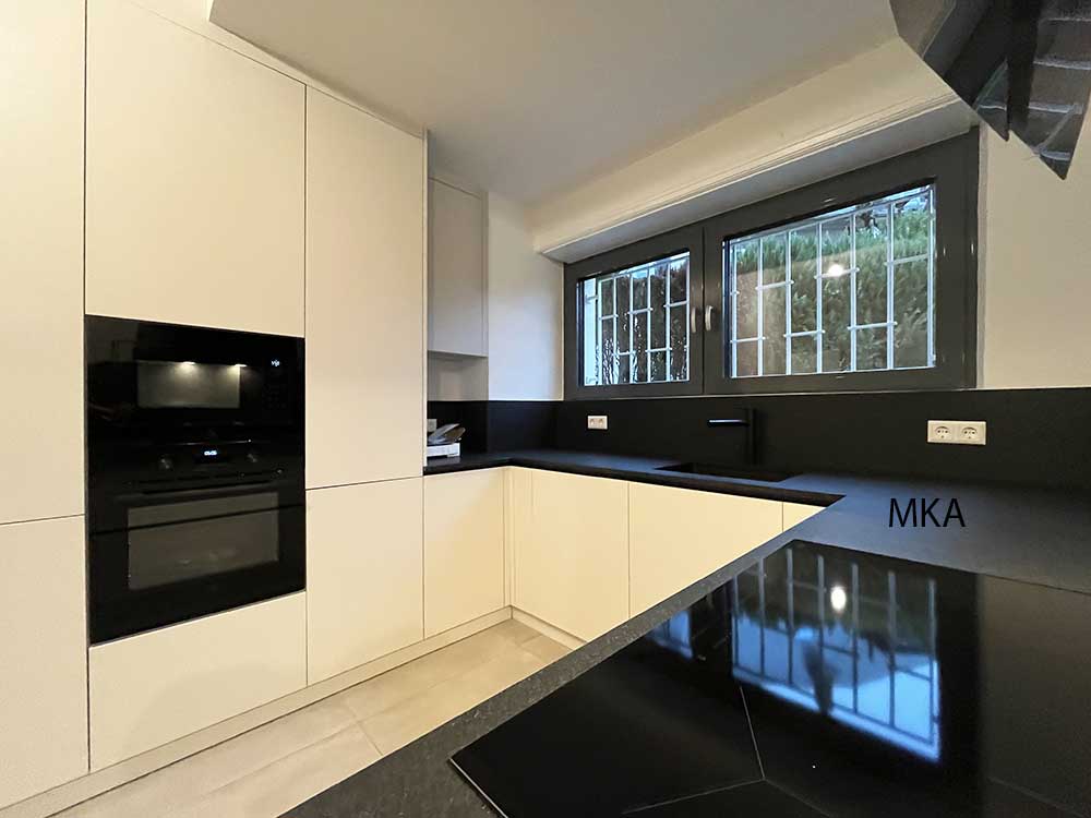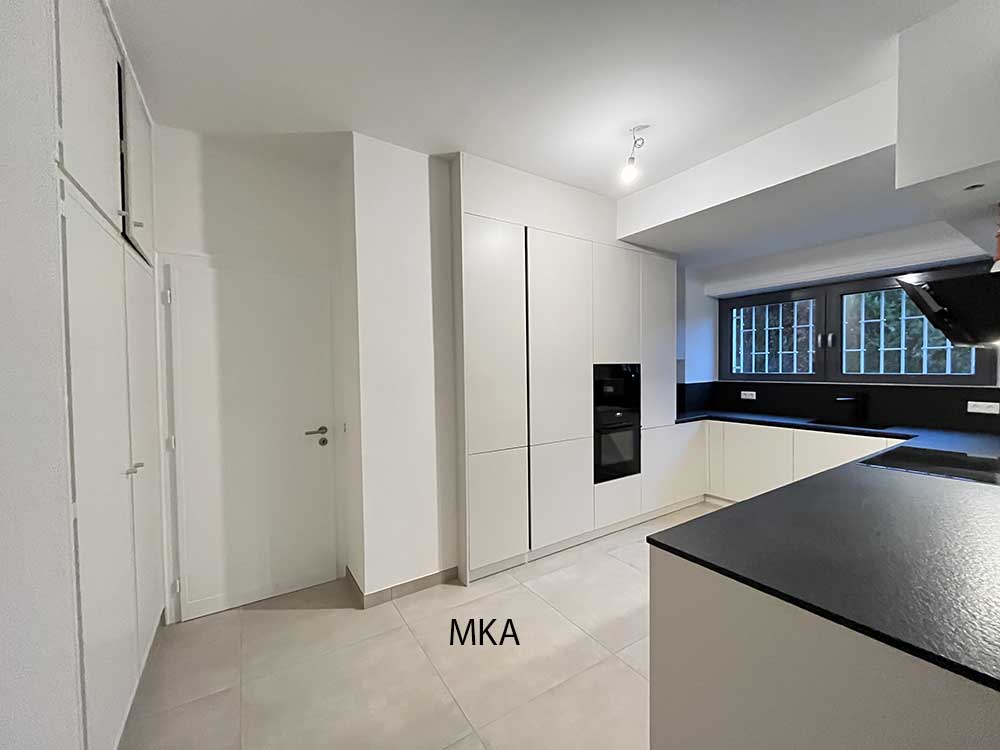 Cuisine équipée séparée avec armoires encastrées, donnant accès au jardin
