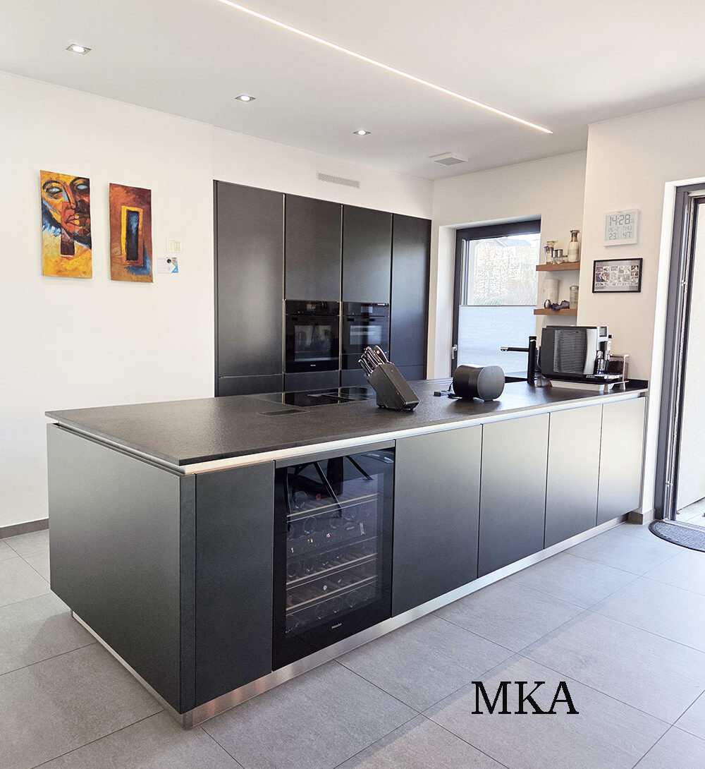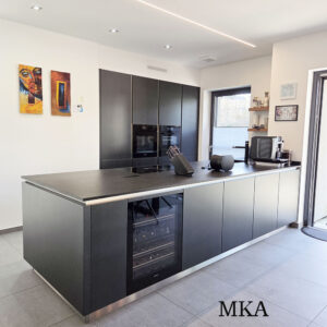 La cuisine dînatoire, aux lignes contemporaines et entièrement équipée, s’intègre harmonieusement à l’ensemble et est sublimée par des aménagements sur mesure, dont une élégante bibliothèque intégrée.